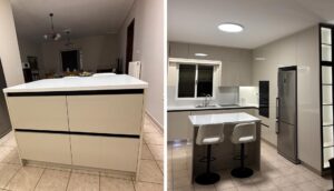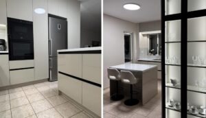 Μοντέρνα κουζίνα με minimal σχεδιασμό και διαχρονική κομψότητα. Ο συνδυασμός γυαλιστερών επιφανειών, ανοξείδωτων συσκευών και διακριτικού φωτισμού δημιουργεί έναν χώρο που αποπνέει πολυτέλεια και λειτουργικότητα. Η πρακτική νησίδα με ενσωματωμένα σκαμπό προσφέρει άνεση για καθημερινή χρήση, ενώ τα εργονομικά ντουλάπια και οι εντοιχισμένες συσκευές μεγιστοποιούν τον διαθέσιμο χώρο. Ιδανική επιλογή για όσους αναζητούν μια κουζίνα υψηλής αισθητικής και σύγχρονης πρακτικότητας.