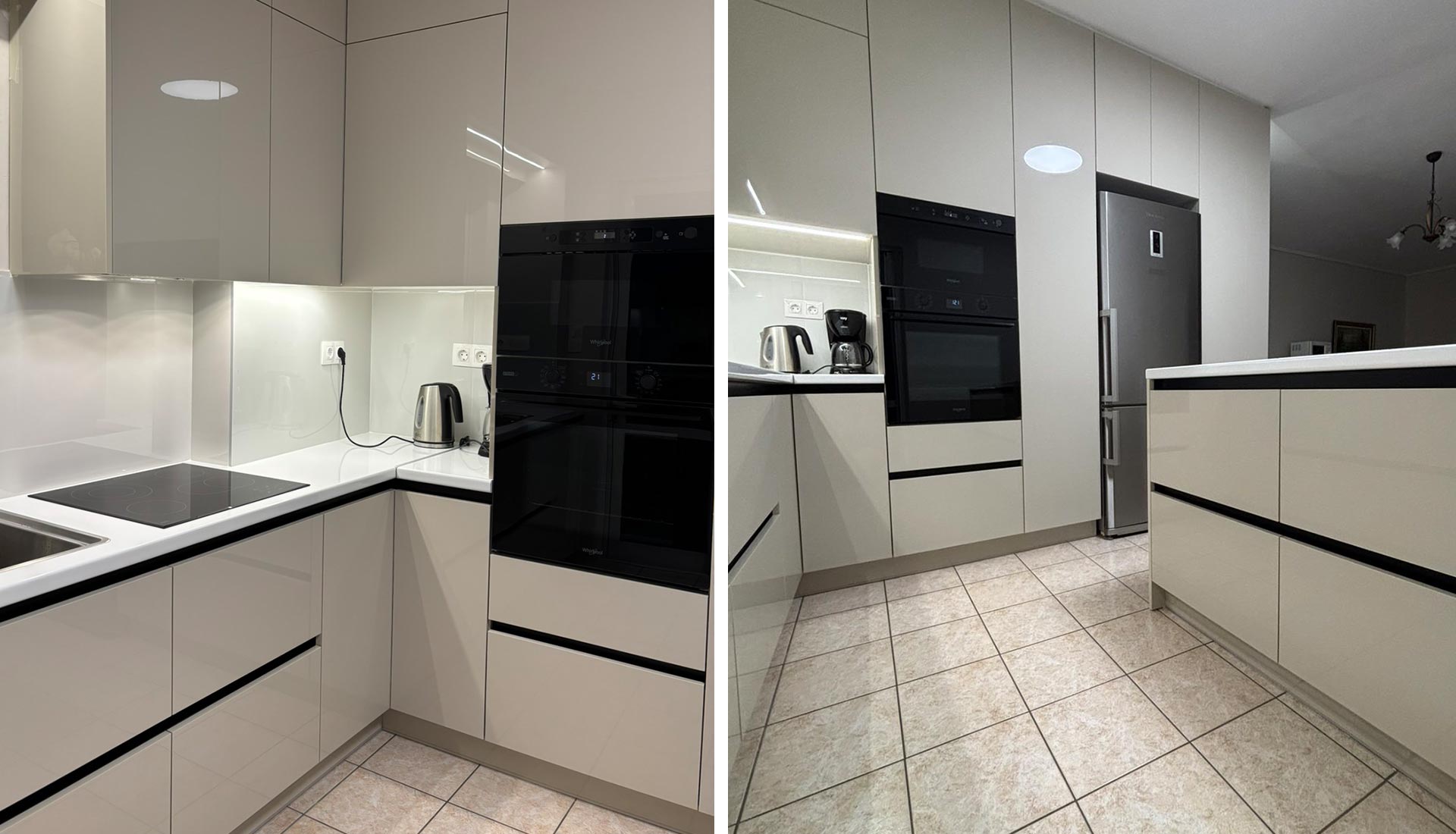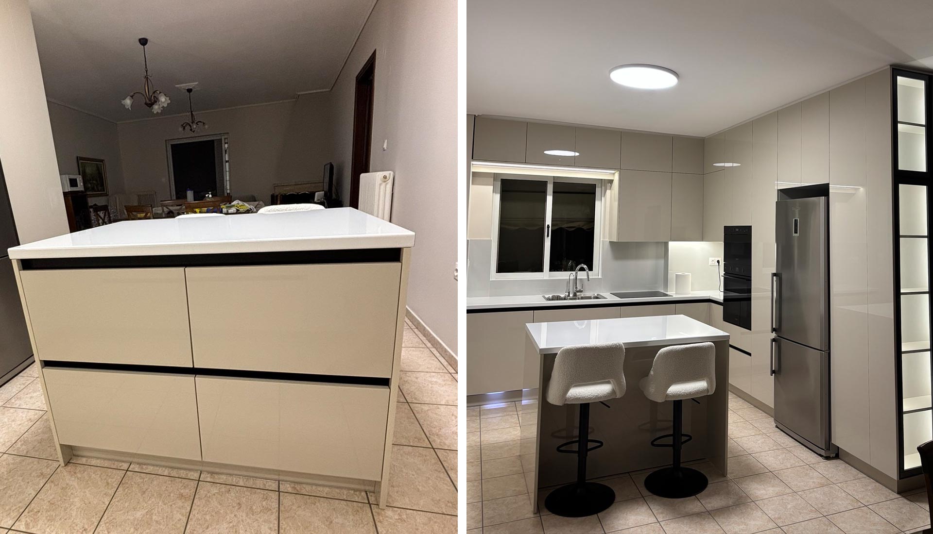 Μοντέρνα κουζίνα με minimal σχεδιασμό και διαχρονική κομψότητα. Ο συνδυασμός γυαλιστερών επιφανειών, ανοξείδωτων συσκευών και διακριτικού φωτισμού δημιουργεί έναν χώρο που αποπνέει πολυτέλεια και λειτουργικότητα. Η πρακτική νησίδα με ενσωματωμένα σκαμπό προσφέρει άνεση για καθημερινή χρήση, ενώ τα εργονομικά ντουλάπια και οι εντοιχισμένες συσκευές μεγιστοποιούν τον διαθέσιμο χώρο. Ιδανική επιλογή για όσους αναζητούν μια κουζίνα υψηλής αισθητικής και σύγχρονης πρακτικότητας.